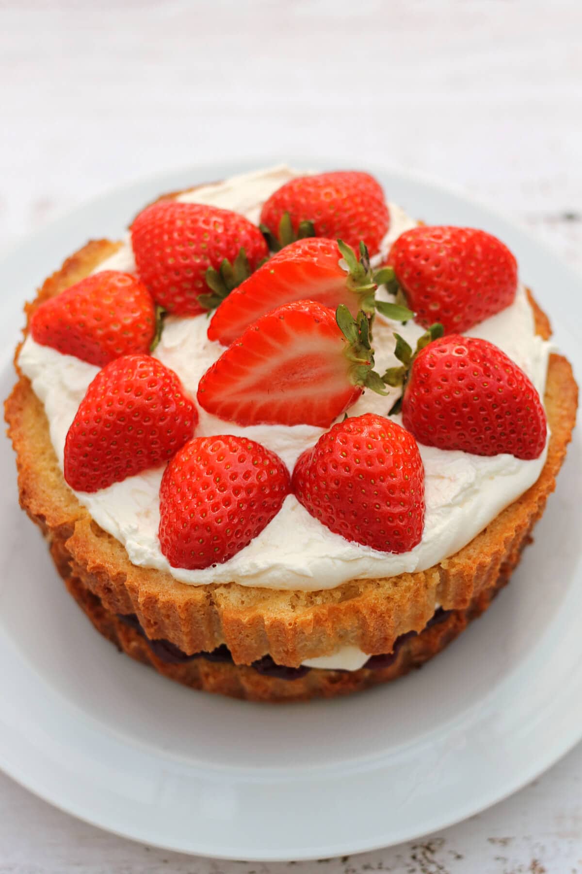 Filled with strawberry jam and whipped cream, and with more cream on top and fresh strawberries, it is the perfect addition to a summer barbecue or picnic.